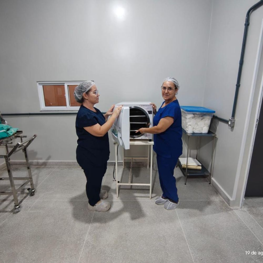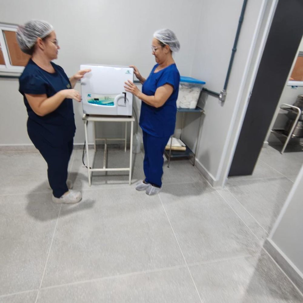 Ambiente: Área de Preparo e Esterilização (Setor Limpo) — Suporte de Hamper (1), Autoclave Horizontal de Mesa (até 75 litros) (1)